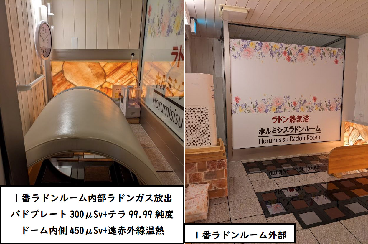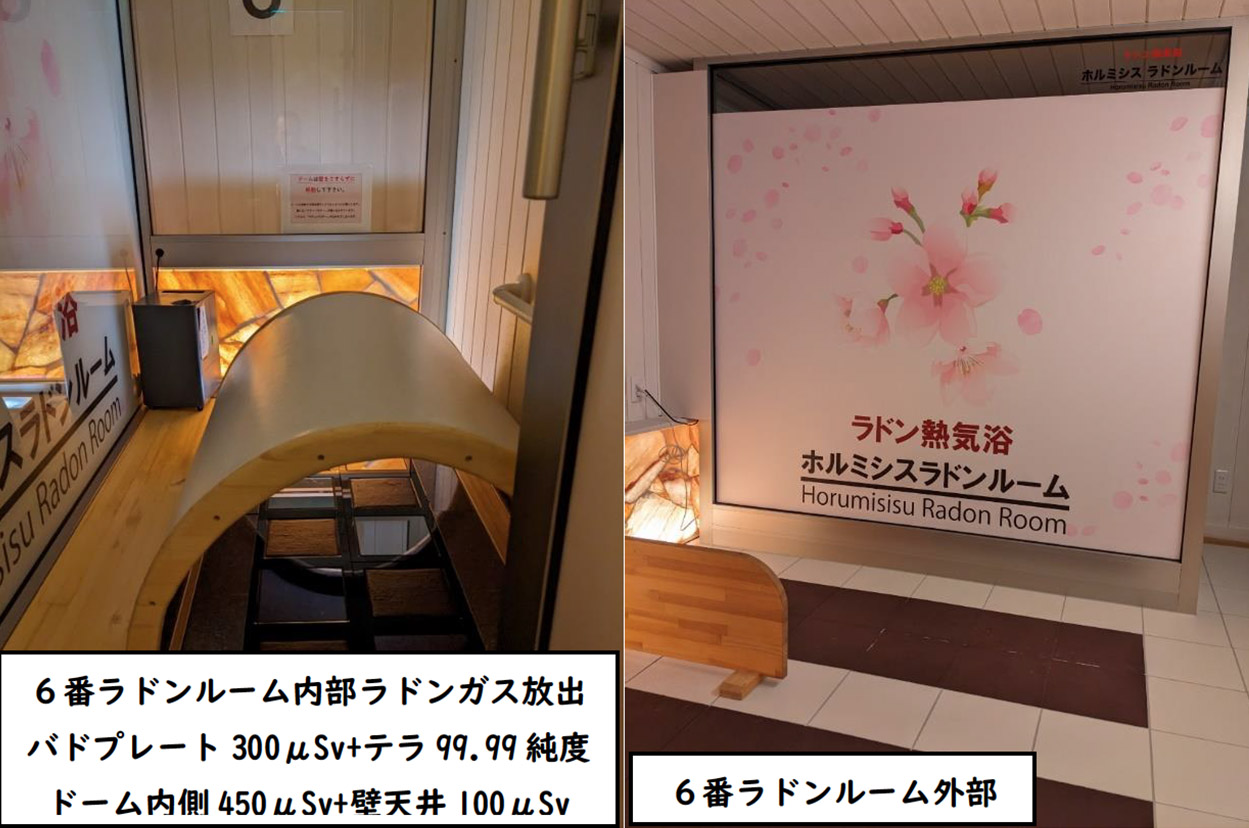 1番と6番の放射線量は人の体に良い影響を与えてくれるホルミシスの安全な低線量放射能線です。秋田の玉川温泉や鳥取の三朝温泉のようなラジウム温泉やラドン温泉の効能を体感して下さい。1番も6番もラドンガスが放出されるのは同じです。どちらも体験されてご自身に合う方をご利用下さい。